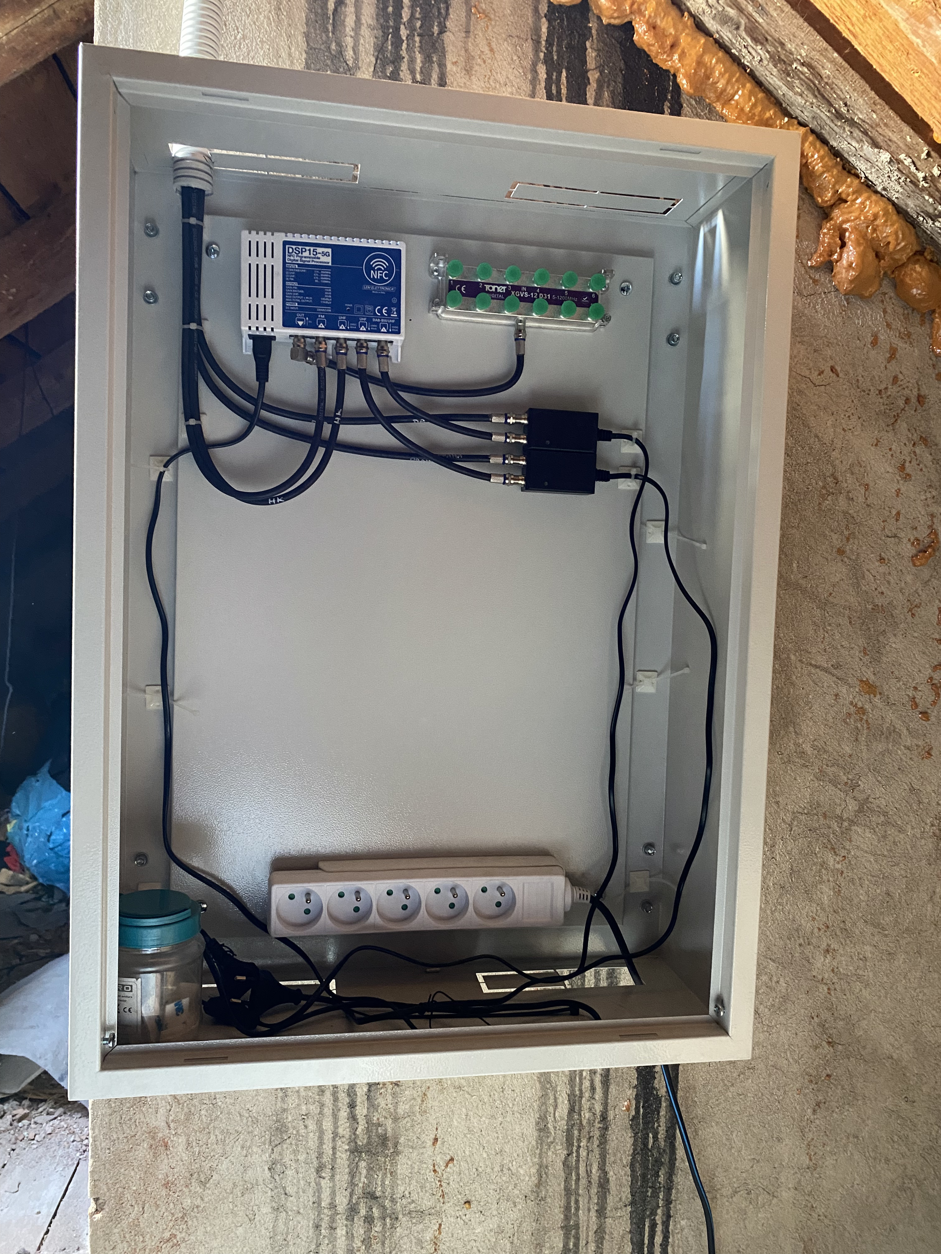 Rozvodnice umístěná na půdě rekonstruovaného rodinného domu, programovatelný zesilovač LEM DSP-15 HFC (programovatelný mobilním telefonem), rozbočení na 12 účastnických zásuvek, příprava na osazení switche.