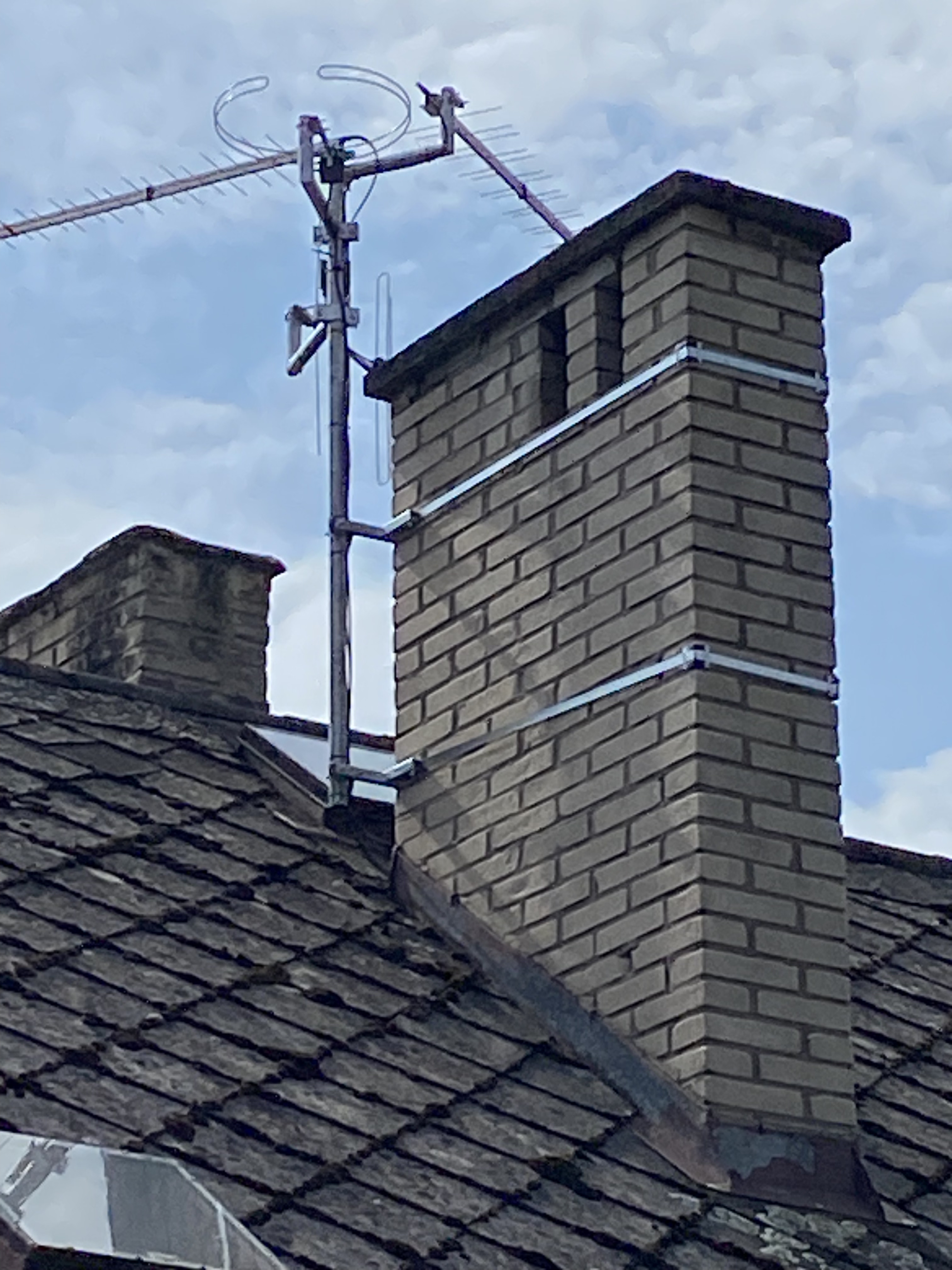 držák stožáru na komín, antény pro K26, 28, 34, 38 a 45 směr Hradec Králové, anténa K46 Praha, anténa DAB+, anténa FM